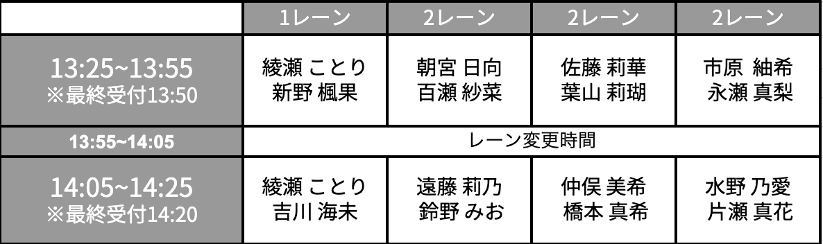 ※当日の状況により、レーンを変更させていただく場合がございます。予めご了承ください。