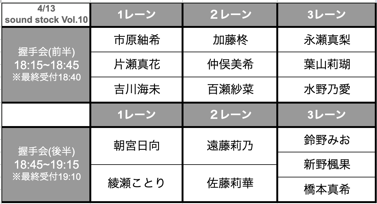 4月13日(月)開催「sound stock Vol.10」にて実施予定の特典会(握手会)レーン詳細および販売情報をお知らせいたします。